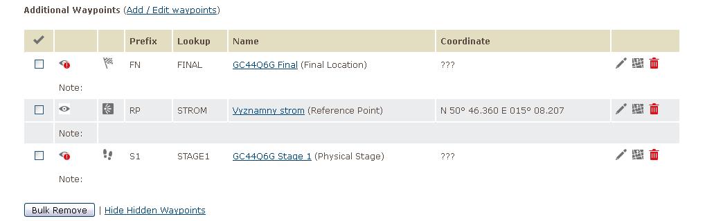 V další ukázce vidíme dva waypointy, které mají skryté souřadnice. Jedná se o souřadnice fyzických schránek typu Physical Stage a Final Location. Neobsahují popis zadání pro výpočet souřadnic, proto jsou běžným kačerům skryty úplně. Zároveň je zde také ukázka waypointu Reference Point. Autorovi cache se na rozdíl od ostatních cacherů zobrazují v pravé části tabulky s waypointy tři klikatelné obrázky. Pomocí prvního se dostane do formuláře pro správu waypointů, kde může provést editaci daného waypointu. Kliknutím na druhý obrázek se v novém panelu otevře mapa vycentrovaná na souřadnice uvedené ve waypointu. Pomocí třetího obrázku lze daný waypoint jedním kliknutím smazat. Pro hromadné smazání zde má owner tlačítko Bulk Remove.