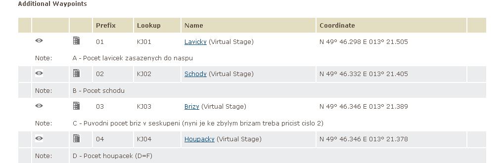 Zde vidíme zastávky multicache typu Virtual Stage, u nichž je plně zobrazen popis i souřadnice. Body si mohou uživatelé stáhnout do navigace. V popisu je stručně uvedeno, jaké informace je potřeba na daných souřadnicích zjistit.