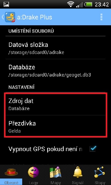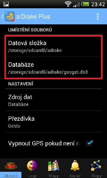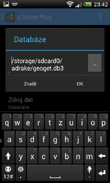 Teď už a:Drake sice ví, že bude data tahat z databáze, ale pořád neví ze které. Přednastavená databáze cachedb.db3 ve složce programu a:Drake je prázdná a proto si zde Gelda nastaví svoji vlastní databázi – geoget.db3. Jde o úplně stejnou databázi, se kterou ve výchozím nastavení pracuje GeoGet.
