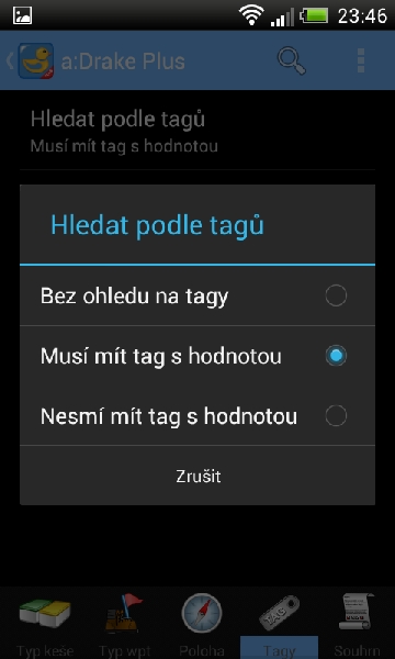 Gelda moc dobře ví, že kdo umí používat tagy, GeoGetu vládne. Proto v nabídce filtrů přejde na záložku Tagy (na malých displejích možná nebude vidět, ale je tam). Najít kešky ve vybraném okresu přece není problém, v GeoGetu je tag se jménem okresu. Proto změní první hodnotu nastavení, Hledat podle tagů, na Musí mít tag s hodnotou.