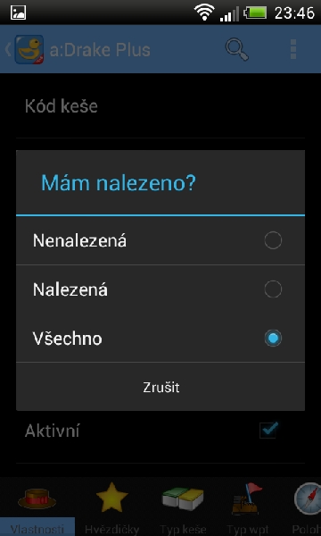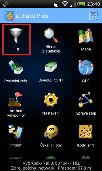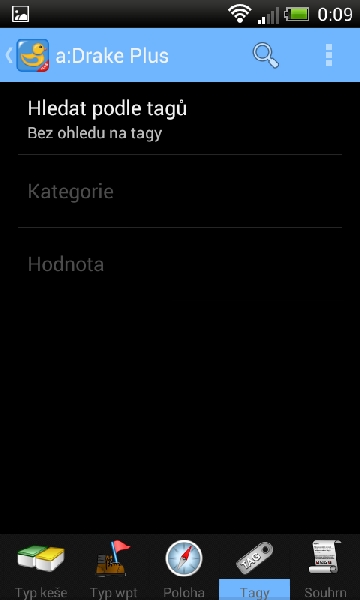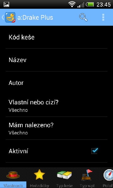 Gelda má tagy moc rád a považuje je za jednu z nejlepších vlastností GeoGetu (navíc s nimi umí pracovat i a:Drake a proto si ho koupil). V hlavním menu volí nabídku Filtr. Filtrovat je možné podle mnoha možností, nejzákladnější je nabídka Vlastnosti (tip: pomocí nabídky Mám nalezeno? odfiltrujete již nalezené keše).