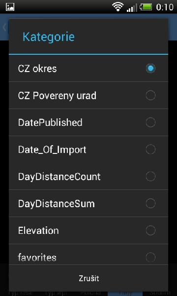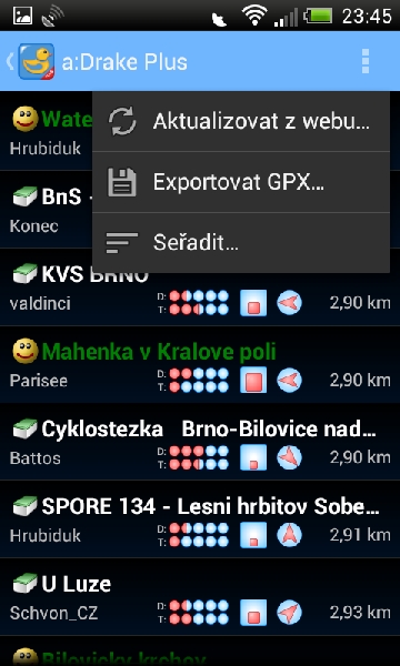 Pomocí této nabídky je možné exportovat GPX, aktualizovat kešky a nebo řadit.