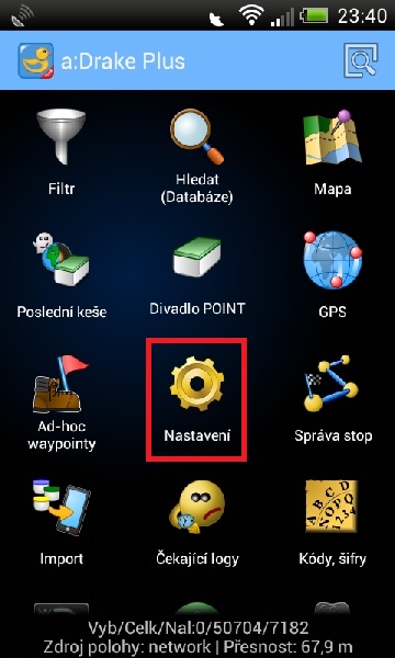 Nejdříve si Gelda spustí a:Drake a v hlavním menu jde do Nastavení. Nejprve si nastaví nick (přezdívka na Geocaching.com) a zdroj dat (odkud bude a:Drake tahat data). Pro zdroj dat jsou na výběr dvě možnosti – Geocaching Live (vyžaduje přístup na internet) a Databáze.