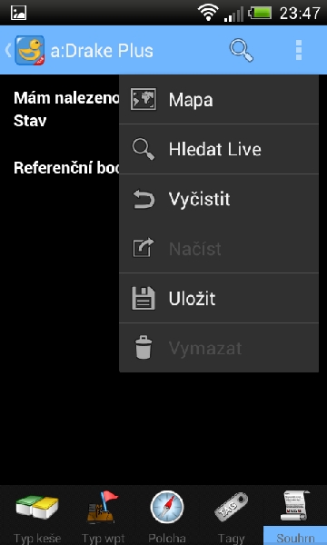 Vzhledem k faktu, že do cíle zbývá jediná zastávka, tak proběhne aktualizace i již nalezených keší (co kdyby chtěla nějakou odlovenou keš hledat Geldova přítelkyně). Kontextová nabídka je trochu ukrytá, ale vyvolává se buď stisknutím tří teček vpravo dole (např. na tabletu Nexus 7) nebo delším přidržením tlačítka s nabídkou posledních aplikací (např. jako níže na HTC Desire X). Která z možností funguje na vašem telefonu musíte vyzkoušet (tlačítko se možná bude měnit v závislosti na typu telefonu). Prakticky platí že pokud nejde první možnost, jde druhá. Nabídka vypadá jako níže.