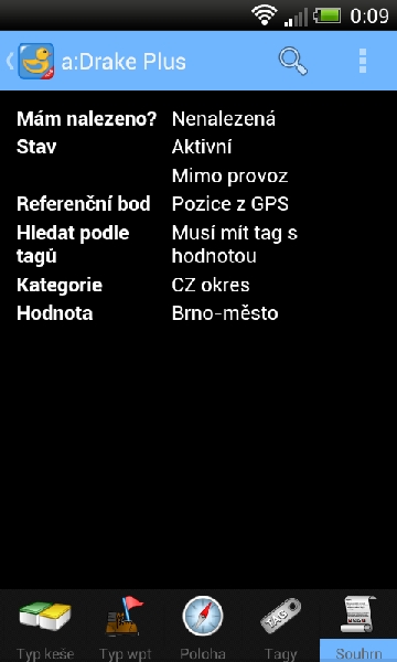 Na závěr ještě Gelda zkontroluje nastavení filru. To provádí pomocí nabídky Souhrn. Tato nabídka vypíše kompletně zadaný filtr. Gelda zadal filtr, který vybere aktivní a disablované keše v okrese Brno-město.