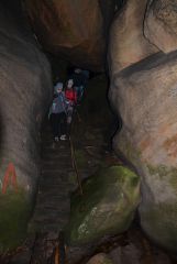 Dál jsme pokračovali na Supí koš. Aneb přesně podle definice „zkratky“ – je to po horší cestě, zato delší cestou. Na druhou stranu shora byl krásný výhled na Broumovskou kotlinu. Cestou nahoru (a vlastně i dolů) jsme se někteří málem „zrakvili“, nahoře jsme si rychle udělali pár společných foteček, a většina vyrazila rychle směr Hvězda – hospoda. Já a hlouček „statečných“ jsme zde zůstali na větru a fotili jsme zde ještě krásné výhledy na noční krajinu v okolí. Horší pak byla cesta dál, kdy jsem za svitu slaboučké baterie z klíčů skoro nic neviděl a po umrzlých hřebenech Broumovských skal jsme museli pokračovat na Hvězdu. Naštěstí Geopařman a Jirka nám trochu s Danou svítili a Dana vyprosila od někoho trochu lepší baterku, než jsme měli z domu, takže jsme nakonec pomalejším tempem dorazili kolem tři čtvrtě na 12 konečně na Hvězdu.