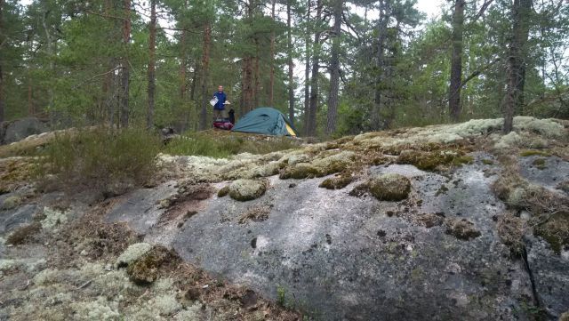 Všechny tyto raritní kusy stojí ale ve venkovní expozici vystavené povětrnostním vlivům. Pozorně oblézám všechnu techniku a vykládám Romanovi historii jednotlivých typů a přidávám i pár zajímavostí. Bohužel nás opět dohání náš starý nepřítel čas. Máme totiž dopředu zakoupeny jízdenky z Paroly. Musíme tedy vyrazit směr nádraží. V plánu je totiž přesun do Espoo, které leží severozápadně od Helsinek. Zde máme v plánu malý trail o 50 kouskách. Z mapy bylo vidět, že vede mimo obydlenou oblast, což nám úplně vyhovovalo. Po příjezdu do Espoo doplňujeme vodu v místním obchodě s potravinami a rozhodujeme se lehce změnit plán. Pojedeme autobusem k poslední keši série a trail půjdeme z opačné strany. Dál od města bude totiž jednodušší najít místo pro přenocování. Vydáváme se tedy linkou 246 do zastávky Pirțțimäķi, kde je konec trailu. Je okolo sedmé hodiny večerní, ale slunce je stále aktivní. Nacházíme několik okolních keší a míříme na trailové krabičky. Už na začátku je nám jasné, že jsme udělali dobře. Krajina je tu překrásná. Lesy tu doplňují jezera všech velikostí. Jelikož víme, co nás druhý den čeká, dáváme prioritu odpočinku a nalezení vhodného místa pro náš stan. To se nám nakonec daří na skále poblíž cesty. Stavíme stan a při plánování zítřejšího dne večeříme. Zítra má být až 21 stupňů přes den. Usínáme hned, jak vlezeme do spacáků.