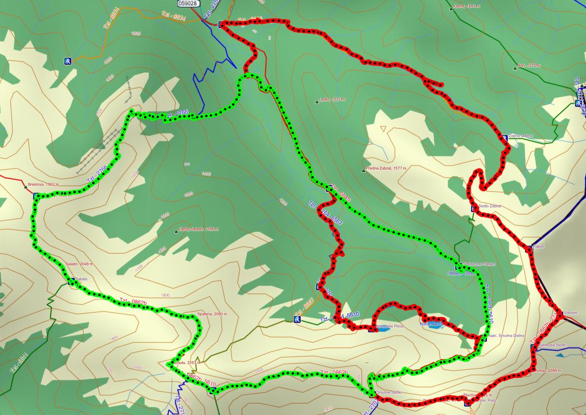 Cesta dál už byl chvíli odpočinek po pohodlné cestičce přes méně rozeklané a zatravněné vršky Spálenou (2083) na Salatín (2042 m.n.m.) (na obou vrcholech jsme si samozřejmě odlovili i zdejší kešky, které byly snadno k nalezení). Tady zatím cesta ubíhala celkem rychle, protože nevedla ještě tolik z kopce. Ze Salatínu už to bylo horší. Cesta začala prudce klesat a přes malý výšlap na Brestovou (1903 m.n.m.) , kde také byla keš, nás čekalo už jen prudké klesání. A to klesání bylo pro nás skoro větší utrpení, než když jsme stoupali ráno nahoru. Možná díky prudkému sklonu cesty, možná i kvůli únavě.
