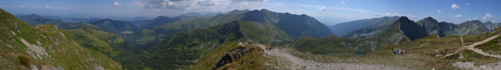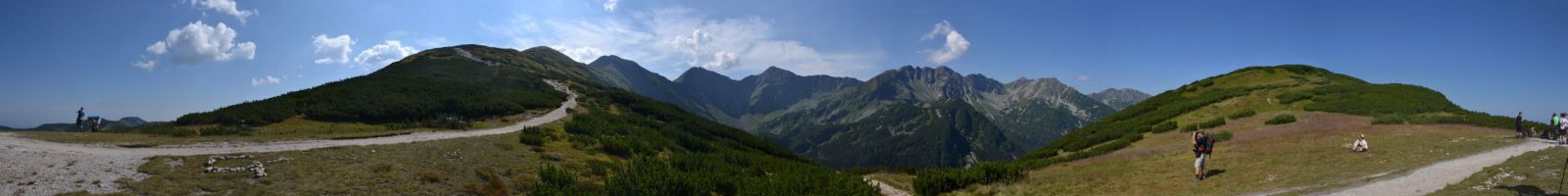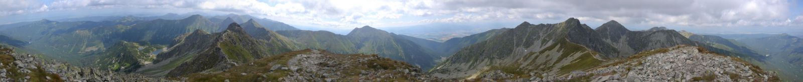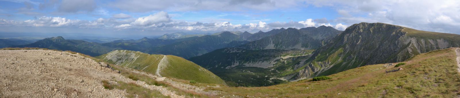 Panorama ze sedla Zábrať (Rákoň, Volovec, Ostrý Roháč, Plačlivé, Tri kopy, Hrubá Kopa, Baníkov, Salatin)