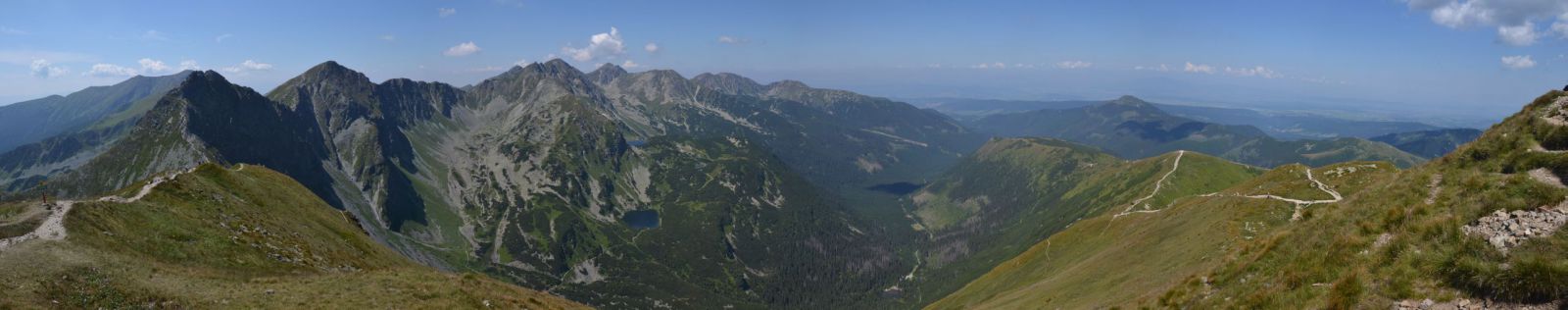 Výhled z Trí kop (vlevo Hrubá kopa, vpravo druhé vrcholky Trí kop, za nimi Plačlivá, dole Roháčská plesa)