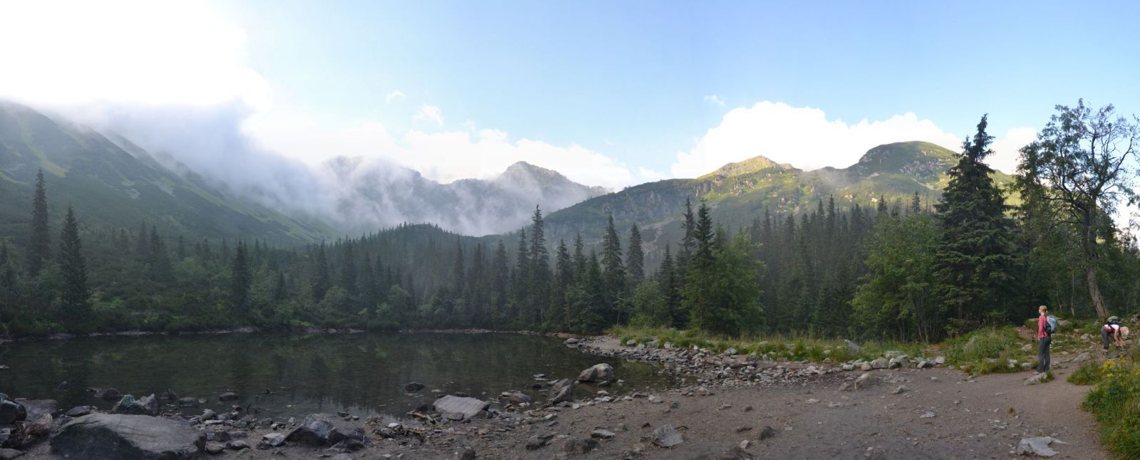 Z Parkoviště jsme pokračovali Roháčovou dolinou k Tatliakově chatě u Tatliakova plesa. Od plesa jsme ještě obdivovali výhled na vrcholky ještě trochu zahalené v bílé cáry mraků ozářené ranním sluncem. Trochu se sám divím, že u Tatliakova plesa není jediná keš, přitom je to také jedno z krásných míst Roháčů. Částečně jsme šli trasou, kterou jsme šli minule druhým směrem. Ovšem ani nám to moc nevadilo, protože v ranním slunci a oparu to tu vypadalo úplně jinak.