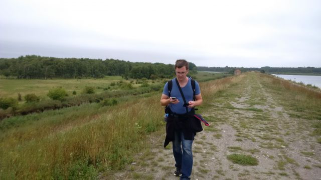 Těsně před městečkem Dragor máme štěstí a přestává pršet. Navíc je zde i obchod, kde dokupujeme vodu a pár lahví dánského piva. Starobylé městečko Dragor leží asi 12km od Kodaně a založeno bylo už v průběhu 12. století. Postupem času se z malé rybářské vesničky rozrostlo v jeden z největších rybářských přístavů v zemi. Samo jméno Dragor lze rozdělit na Drag, což znamená vytažení lodi na břeh a Or, což je místní výraz pro štěrkovo-písečnou pláž. Při pohledu do mapy zjišťujeme, že v přístavu je keš, která tam dříve nebyla. Díky srpnové akci Groundspeaku se tu objevila nová virtuálka Dragorské molo (Dragor Mole). Úkolem je vyfotit se na na konci mola s výhledem na Oresundský most. Díky mlze však most není úplně celý vidět. I tak je to krásný pohled. Na konci mola je stůl s posezením a tak si dáváme pauzu a konzumujeme dánské pivko. Musíme ale pokračovat. Začíná se pomaličku šeřit a nad hlavou se nám opět začínají prohánět černé mraky. Budeme muset najít nějaké místo pro stany jižně od Dragoru. Procházíme okolo Dragorské pevnosti, která vznikla mezi lety 1910-1915 v očekávání velkého válečného konfliktu. Během první světové války byla plně vybavena, ale nikdy do bojů nezasáhla. Pokračujeme ve zrychleném tempu dál a hledáme místo na spaní. Jižně pod Dragorem je oblast, která je vyhrazena pro hnízdící ptactvo, je zde výslovný zákaz stanování a tak musíme stále na jih. Odlovujeme také povedenou earthku Barrierekysten ved Dragør a pokračujeme dál.