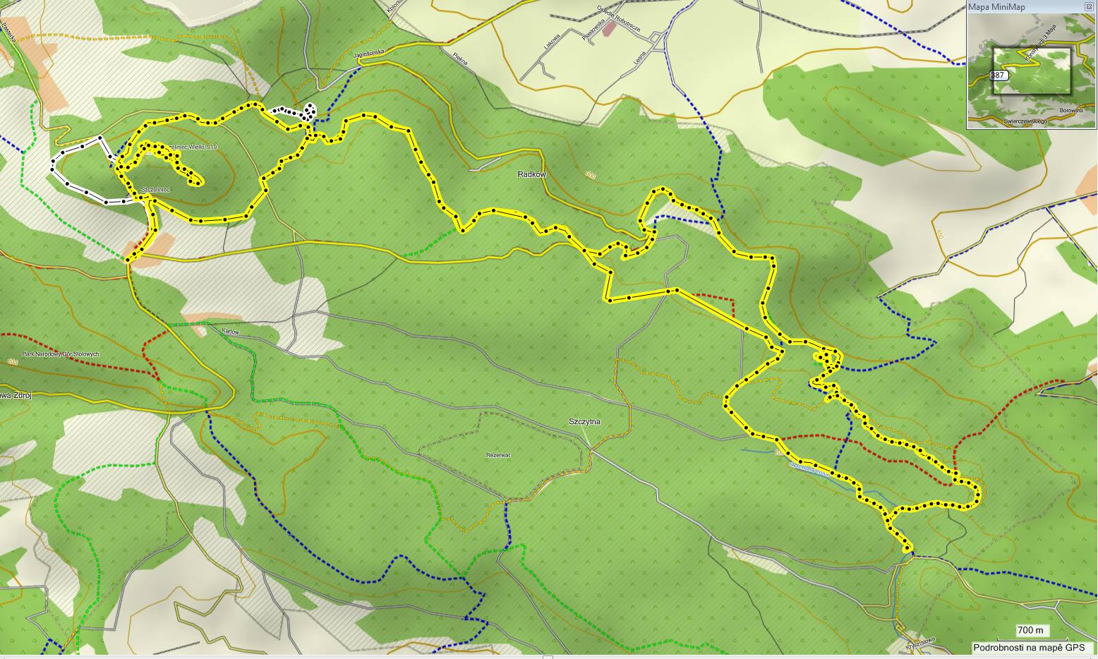Z Batorowku se vydáme zpět po modré turistické značce, kousek po stejné cestě, pak pokračujeme kousek po modré. Ovšem v místě, kde odbočuje modrá z cyklotrasy, tak opustíme modrou a pokračujeme dál po cyklotrase, až dojdeme na červenou turistickou značku, po které pokračujeme dál až na silnici u Stroczeho Zakretu. Odsud musíme pokračovat po červené, kde bohužel trasa vede asi 2 km stejnou cestou, pokud si nechceme trasu trochu zkrátit přímo po silnici do Radkowa.