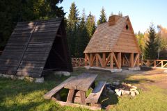 Výhled cestou na Hejšovinu, lesní jezírko a přístřešek v Batorówku