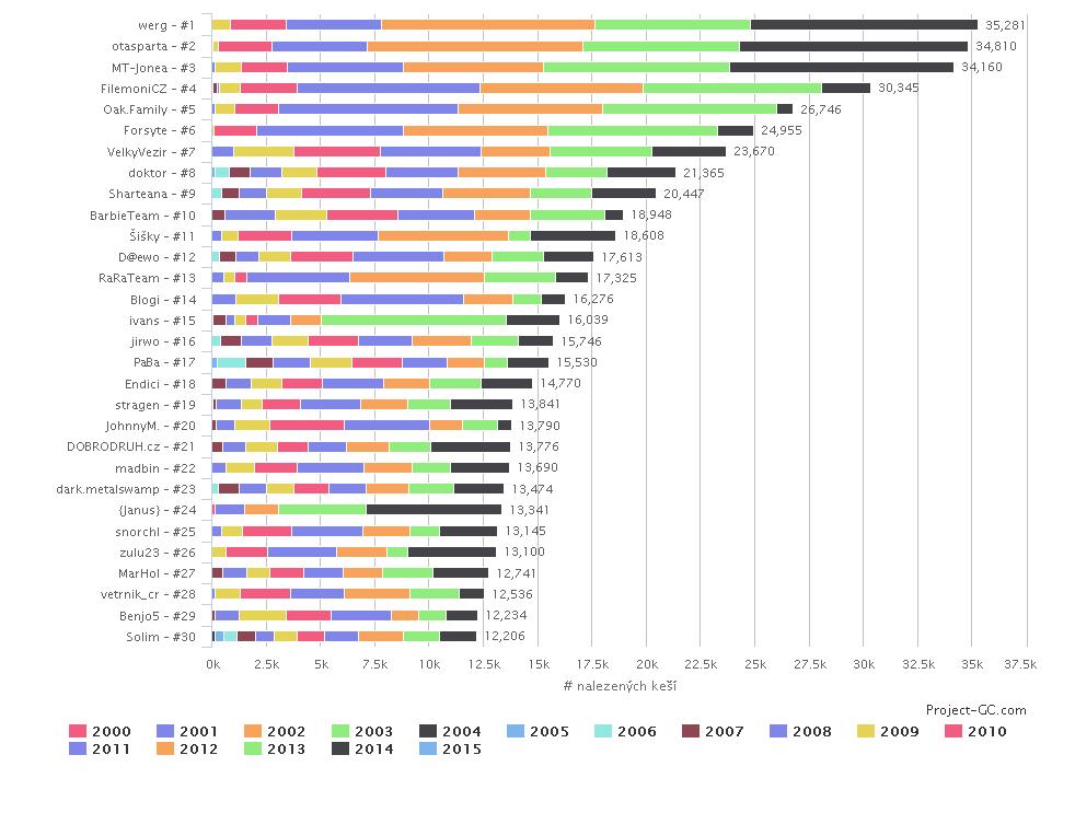Z českých lovců má na svém kontě nejvíc kešek nick werg – 35 281 keší k 31.12.2014.