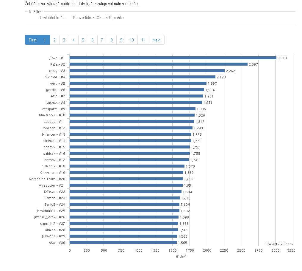Keš s nejdelší dobou od posledního logu (k datu 31.12.2014) je Po dne stare reky – Plavebni komora v Zupanovicich – od poslední návštěvy uplynulo 833 dnů.