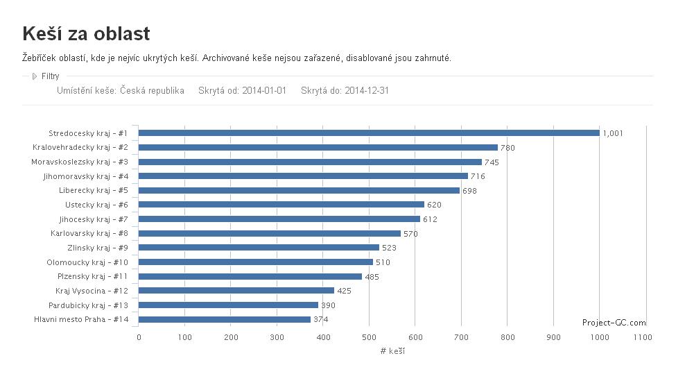 V roce 2014 bylo publikováno v ČR 9 661 keší, z toho bylo v průběhu roku zaarchivováno 1 212 keší. Vloni se také zvýšil počet aktivních geocacherů na rekordních 78 950 nicků.