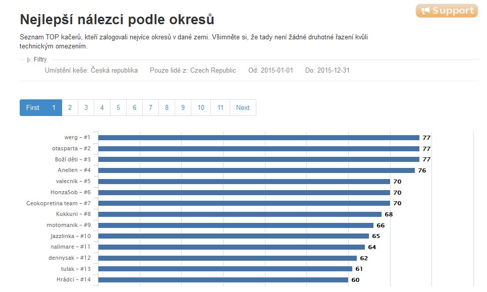 Nejvíce nálezů na území ČR k datu 31.12.2015 nasbíral nick werg a tím je pasován na největšího geovlastence s úctyhodnými 21 405 odlovy.