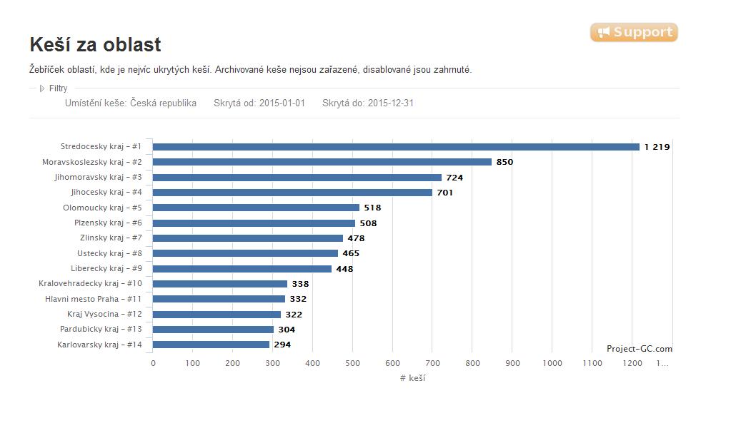 Do logbooků píšeme už pár dní rok 2016 a tak je čas na krátké ohlédnutí za loňským rokem. Nebude to však žádná úvaha nebo psychoanalýza, nabízím vám jen pár zajímavých čísel. Co vše lze vyčíst ve statistikách Project-gc.com (nastavíme-li tam Českou republiku) o keších, které byly založeny v roce 2015? Kdo vystoupal na pomyslnou bednu? Zde je tedy pár údajů, které byly vybrány zcela náhodně a hlavně subjektivně 😉 (Project-gc.com totiž nabízí mnohem víc grafů, čísel a dalšího porovnání).