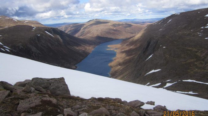 Zázemí jsem nalezl v jedné ze tří zdejších Bothies, jediných stavbách na horách, které slouží jako místo pro načerpání sil kolemjdoucích. Během dvou hodin, kdy vytrvale pršelo, se zde vystřídalo několik skupinek i jednotlivců. Všichni jednotně mi vyvraceli mé odhodlání odpoledne vystoupat na druhou nejvyšší horu Anglie Ben Macdui, počasí prý bude proti mému přání. Ale pršet přestalo a vyklubalo se slunce, nahoře jsem byl motivován ne zrovna snadnou earth keší překonajíc 600 výškových metrů během hodiny a půl, nádherný pocit i výhledy. Pak ale cestou zpátky jsem nevědomky sešel z málo znatelné cesty a dvě a půl hodiny jsem se marně snažil opustit tuto vysokohorskou plošinu ještě pod silnou vrstvou sněhu ohraničenou strmými spády a jezery v hloubce pod ní. Navíc se začínalo nebezpečně zatahovat a přicházela určitá beznaděj uvědomujíc si nezměrnou sílu přírody proti bezvýznamnosti člověka. Nakonec jsem musel znovu najít cestu vzhůru na horu a tam se mi podařilo na jediném místě zachytit signál a pomocí navigace jsem našel cestu zpět.