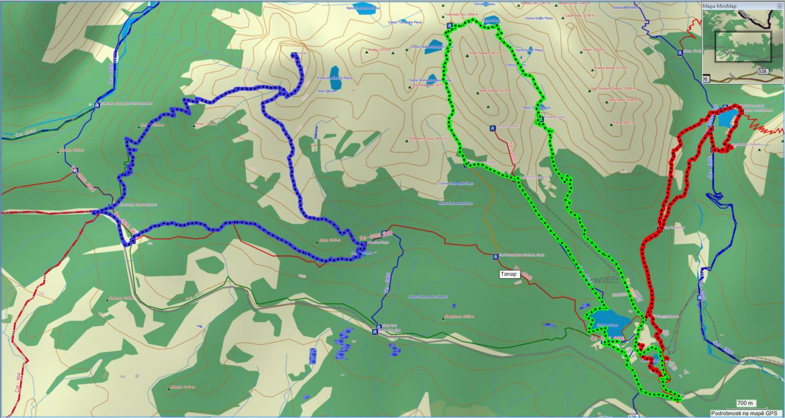 (Červeně – 1. trasa, zeleně – 2. trasa, modře – 3. trasa)