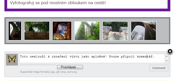 Pozor! Pod popisem výzvy se nachází políčku, kam je možné psát komentáře k výzvě (Write a comment...). Je to jakási obdoba logu Write note u keší. Slouží k napsání poznámky, nikoliv k označení výzvy jako splněné! (O tom, že to je pro mnohé geocachery matoucí, svědčí množství poznámek o smazání komentáře (Comment Removed) v jejich přehledu.)