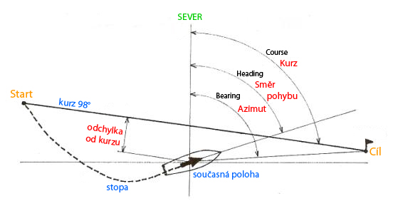 V GPS (v konkrétním případě Garmin Oregon) nalezneme několik funkcí, které zobrazují směr pohybu (angl. Bearing, Course, Heading, aj.). Všechny vychází z obecné definice azimutu, ale každá nám říká trochu něco jiného (viz obrázek).